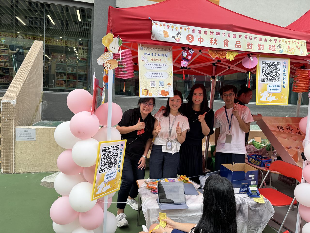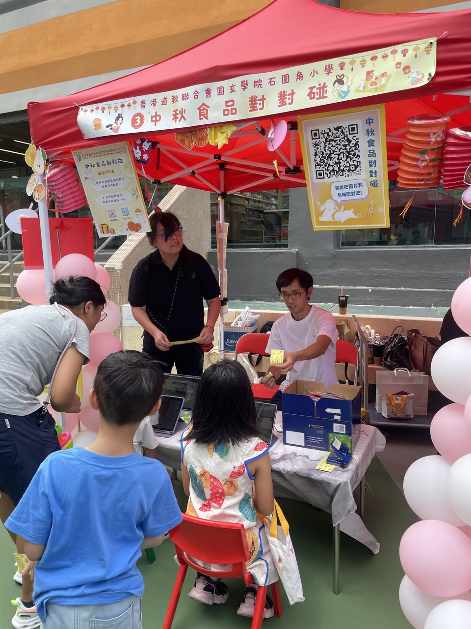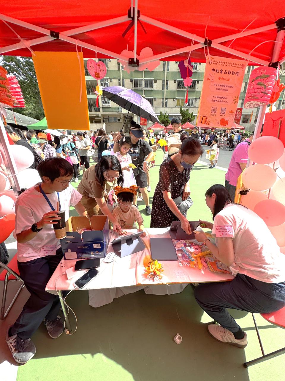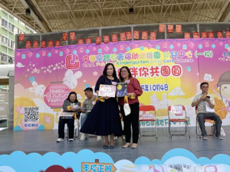 10月4日中秋節前夕,本校獲邀參與由中華基督教會福幼幼稚園舉辦的「福幼伴你共團圓」活動,郭校長為活動擔任嘉賓,與老師們一同與荃灣區的居民及學生共同歡度中秋的傳統節日。今天正值颱風來襲,也懸掛著三號風球,但無阻居民的熱情,一同前來參與攤位遊戲。校長及老師們也忙於接待每一位參與者,更有不少長者到來石小的「中秋食品對對碰」攤位,嘗試以資訊科技來參與遊戲,學習了以英語表達中秋食品,完成遊戲後,更可獲得石小送上的獨特禮物,一起歡度中秋佳節,並送上滿滿的祝福。